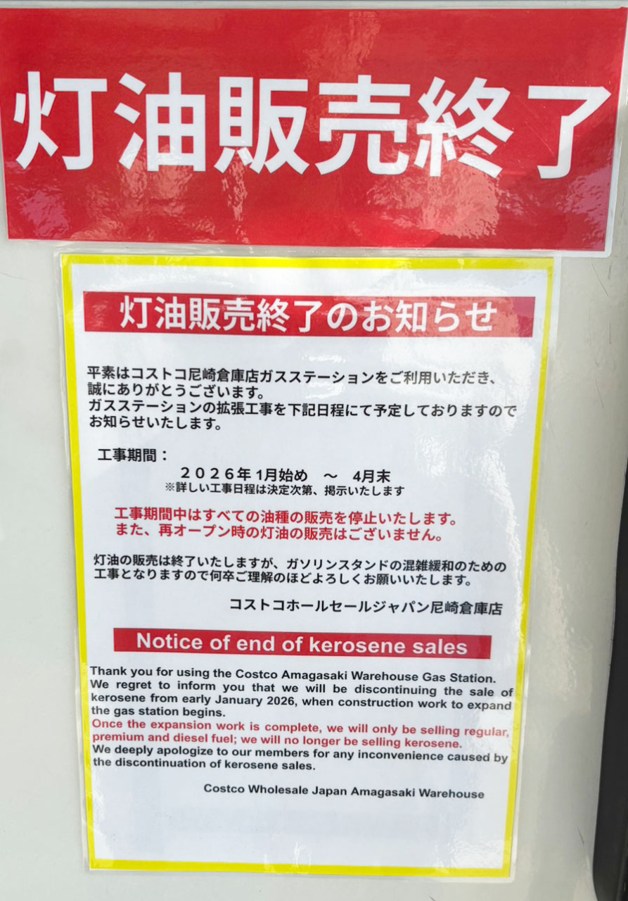 ガスステーション拡張工事を実施!2026年1月始め~4月末それに伴いすべての油種の販売を停止するようです。また再オープン時の灯油の販売はなくなるそうです。 #店舗 #尼崎 投稿者:(名無し)さん id:iQ9b/pP1GVtw2025/10/30(木) 15:29 登録 ★ 11 2 報告 コメント 投稿者の表示 [1] 2025/10/31(金) 07:53 (名無し)さん id:i8nYun2uqAWc 灯油の販売がなくなるのは残念。灯油の販売がなくなるのは残念。 返信 報告 [2] 2025/11/27(木) 16:11 (名無し)さん id:i19KHRusc006 [2](名無し)さんの写真 返信 報告