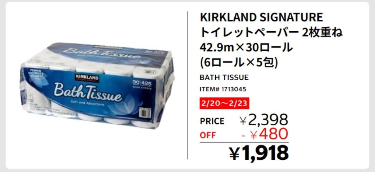 トイペ祭り来ました!メルマガ480円引きの1918円になります。週末の混雑は必至ですね。 参考:コストコ メールマガジンurl:https://cds2.costcojapan.jp/cds/mail-images/upz/260219_ur6r/thu19d/pc_index.html #割引 投稿者:(名無し)さん id:i6hZk9qp7BwU2026/2/19(木) 10:02 登録 ★ 5 0 報告 コメント コメントの登録はありません